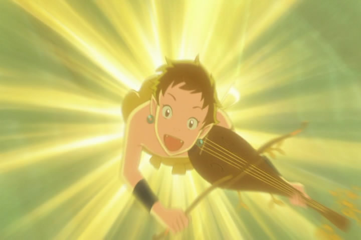 Here we have your classic environmentalist story you see so often in anime: creatures of all races and kinds must band together to create a harmony with which to cultivate life. Unlike Mononoke Hime or even Ponyo on the Cliff by the Sea, however, the message here is so ham-fisted. Harmony is literally achieved by playing giant 3-D instruments.