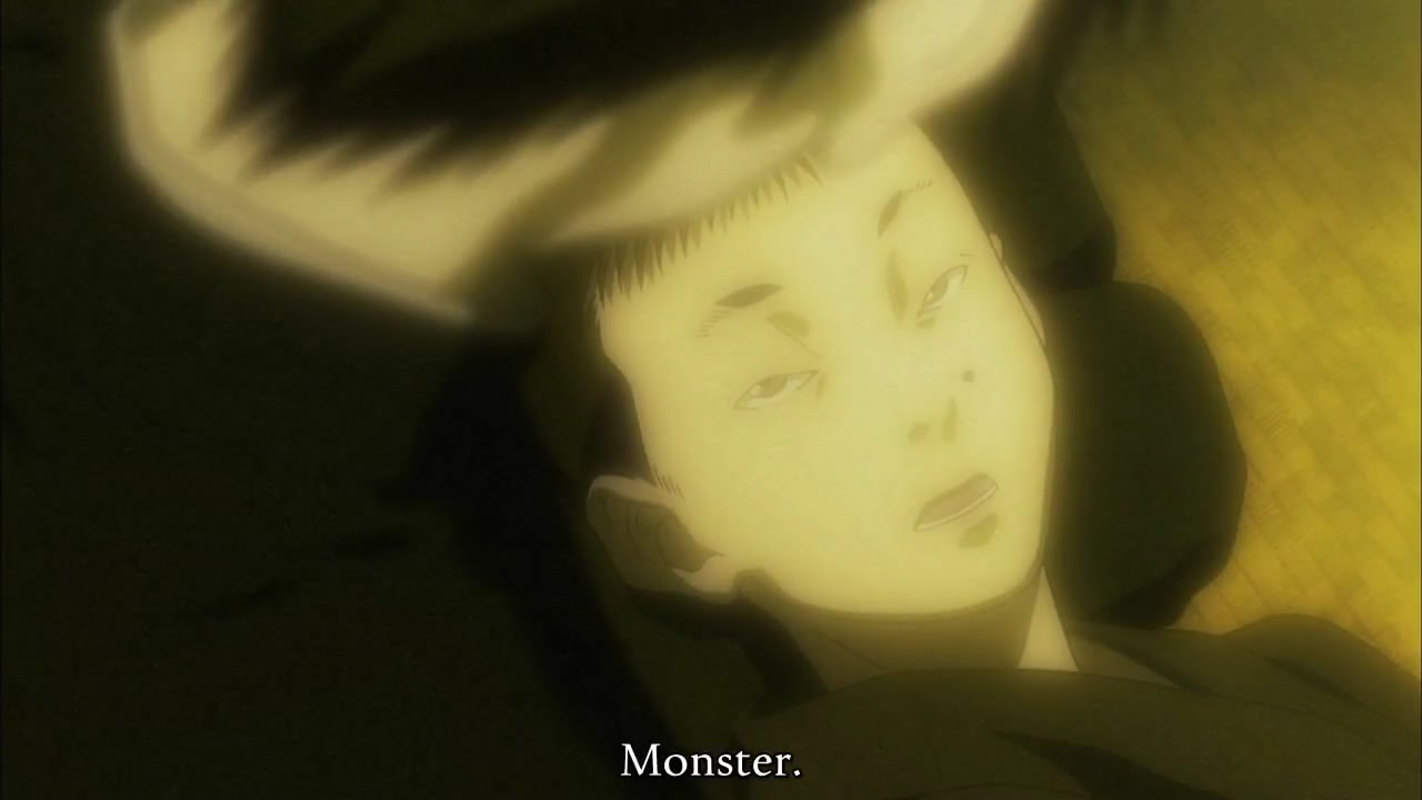 I just think it’s a little… cheap. We know he’s trying to fit into human society. So how do we get it across to the audience that, at any moment, Yozo’s true self could ruin everything? The anime’s answer is by literally having a dark side stalk him. It’s like being beaten over the head with a hammer. I wish they could have done it more delicately. I feel like in the novel, he has more of a resignation that his true self will emerge any moment now no matter how hard he tried to be human.