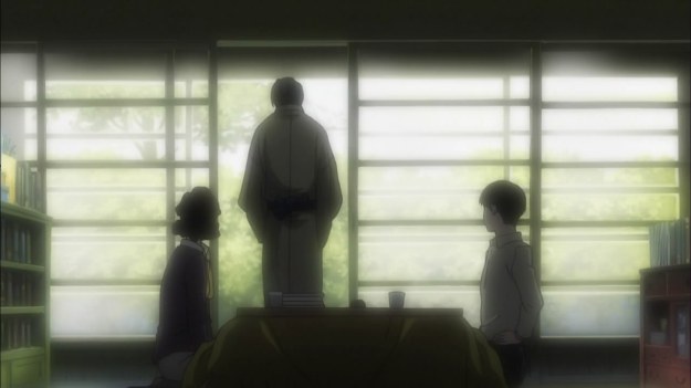 So that others won’t mistake this as a rant against Aoi Bungaku, the answer is an affirmative no. With that said, I’ll try not to repeat my criticisms of episode one in this entry unless it’s relevant. Others have argued that the mystery elements introduced in the anime still happen to fit the original themes of the novel, but I disagree. Yozo’s true character may be murky, especially to those around him, but all the events in the novel are his personal recollections from his personal notebooks. I’m not saying that it is impossible for Yozo to completely misunderstand himself to such a degree that he may or may not have been Tsuneko’s murderer, I just find it unlikely. We can agree to disagree and I’m leaving the matter at that.