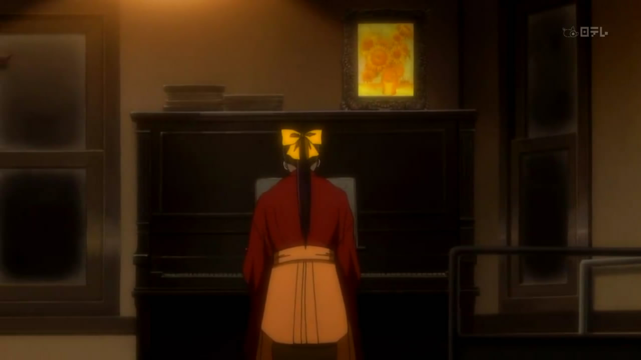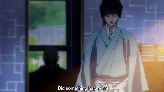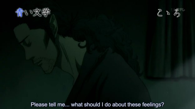 The way the door frames are behind him gave me the suggestion that K had left his room and the yutanpo isn’t his. To be honest, however, my interpretation is tainted by having read the novel in which Ojosan truly does love Sensei in their marriage. Maybe she grew to love him, I don’t know, but I can’t imagine she was so ready to run away from K, even if he meant a lot to her. Madhouse changed a lot from No Longer Human, however, so it isn’t out of the question.