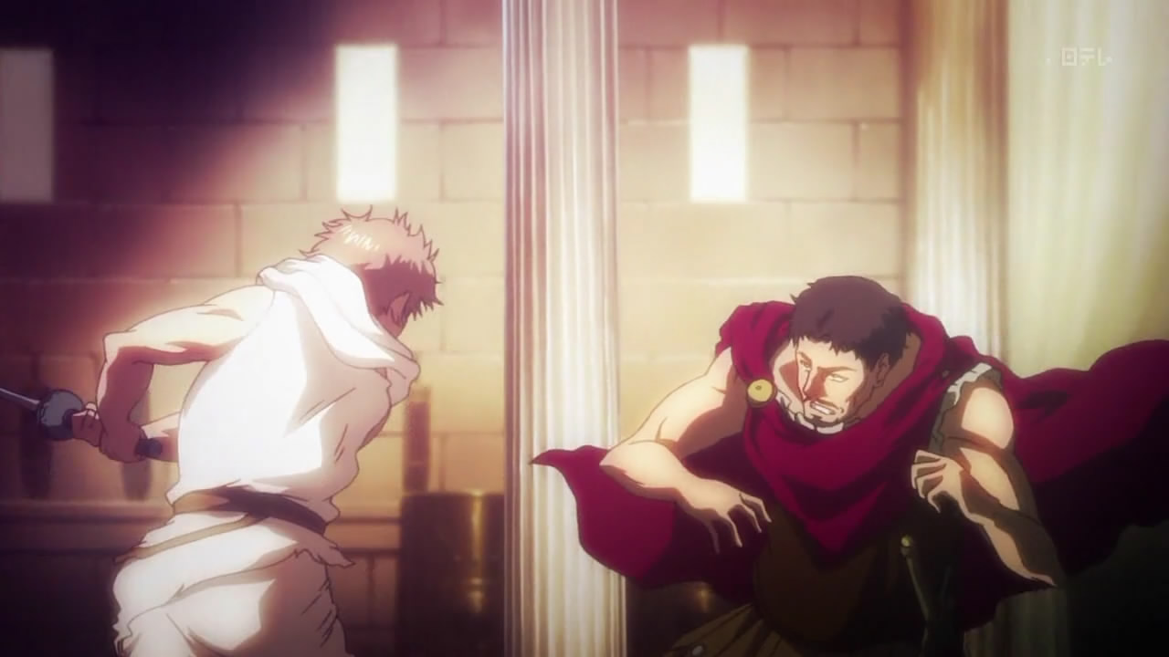But Takada’s mental exercise also fails because Melos isn’t fighting for the right reasons. At one point, Melos fights off bandits, claiming that he must return to Selinuntius out of justice: