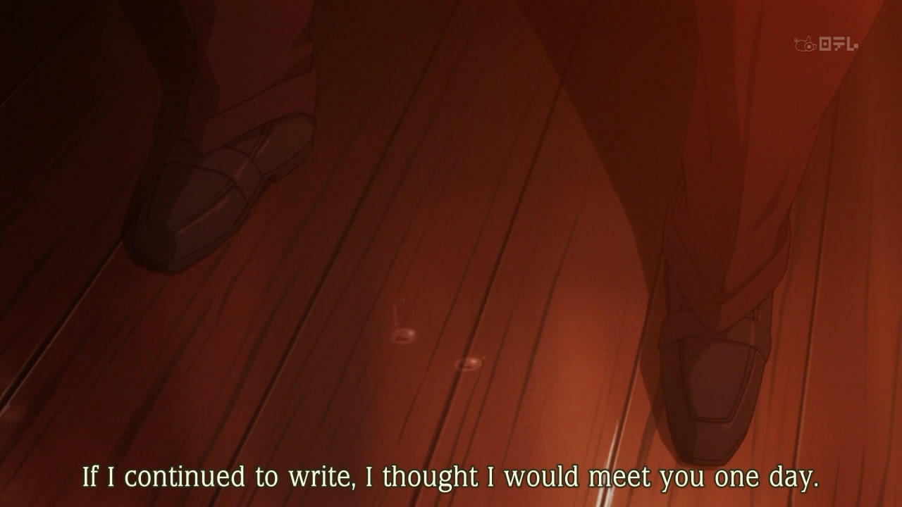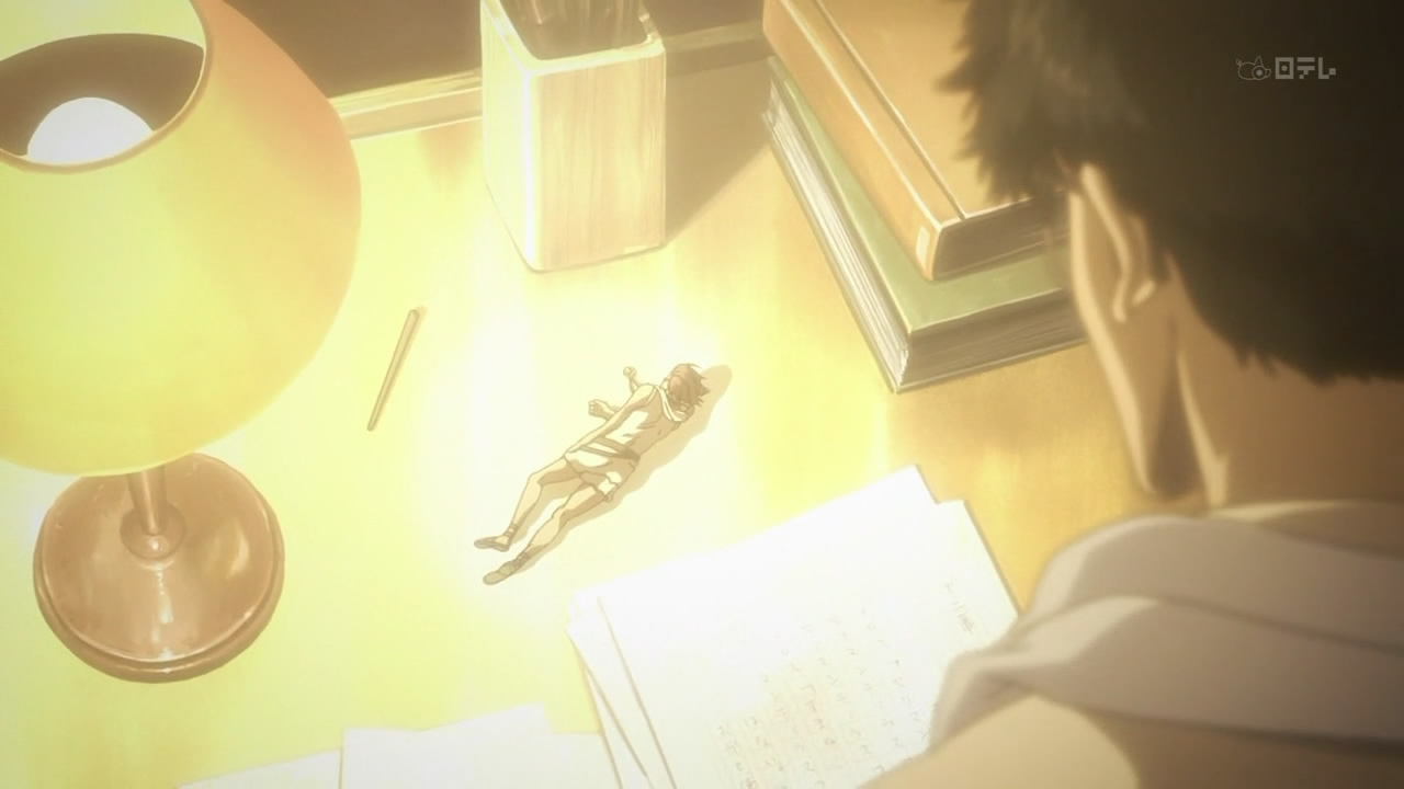 Through “Run, Melos,” Takada is coming to grips with the fact that Joushima was always a true friend, one that always trusted in Takada’s ability as a playwright. These memories couldn’t help but resurface in a hallucination scene when Takada returns to his room to find Joushima imploring him not to tear up “Run, Melos:”