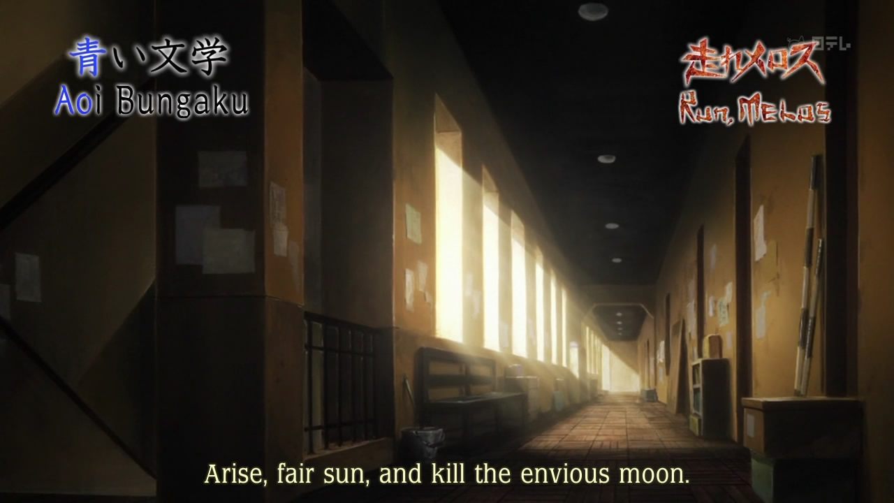 Aoi Bungaku‘s adaptation of “Run, Melos” weaves multiple narratives together into one complex but coherent story, masterfully utilizing the mise en abyme technique to its fullest potential. Although each narrative strand is merely a simple reflection of the legend of “Damon and Pythias,” they build and build upon each other in a unique way to deliver a refreshing story of vengeance, forgiveness, understanding and, naturally, love.