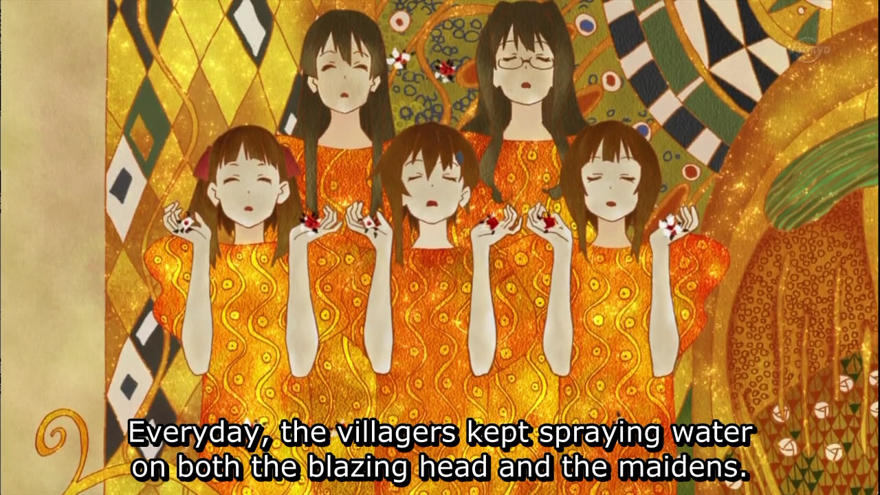 Finally, the theme of redemption is also repeated in the underlying myth of the anime. In the myth, five girls were essentially sacrificed to protect the town. In order to redeem themselves, the villagers ritually re-enact the story over and over again.