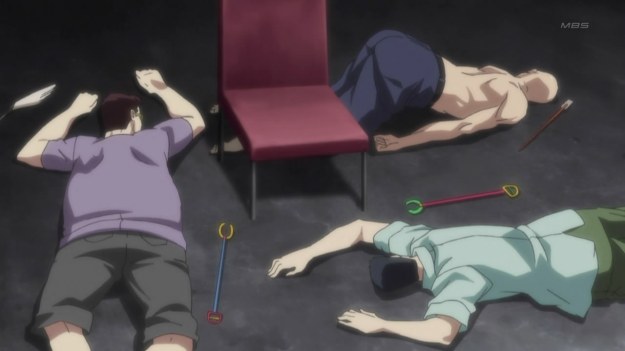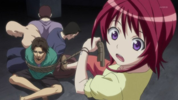 Mafuya ties them up and tells the others to call the cops. You wouldn’t tie them up if they were dead, would you? And isn’t that hilarious? Pervy rapists slash kidnappers suffer a better fate than schoolgirls in this anime.
