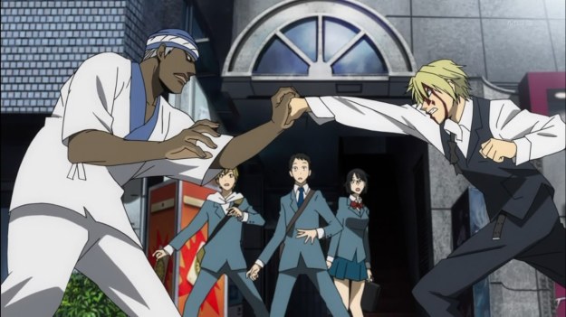 3. It’s going to be twenty-four episodes long. I personally believe few anime should be so long (let’s not talk about the even longer ones). It results in so much dead space, and hell, some anime can’t even handle filling up thirteen. I said earlier that Durarara!! reminded me of Ritchie’s movies. At the end of the day, something like Snatch is just two hours long — everything’s tight and focused. Durarara!! is a long series. As a long series, it develops much, much more slowly to the point where the plot meanders. We have entire episodes just to introduce new characters, for instance. Typically, pacing suffers in stories like this so Narita tries to cover up the lack of purposeful forward thrust with lots of energy.