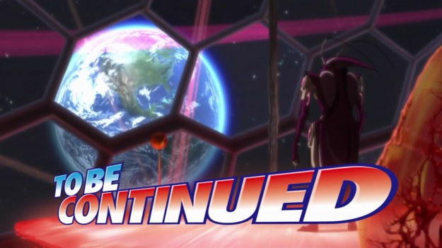 (The scene ends with the saucer flying away from a broken planet, presumably the latest victim of these dastardly bug villains. Oh boy, are the aliens in for a surprise.