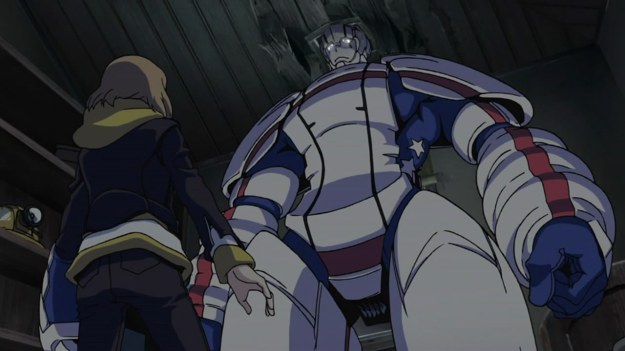 And determineder. What we need to do to save the world and our anime babes is to hide behind pure manliness, stripped of color (except the good ol’ RED WHITE AND BLUE WOO AMERICA), emotions, and crucially, a voice. I’m sorry but the values here are just a little too traditional for me.
