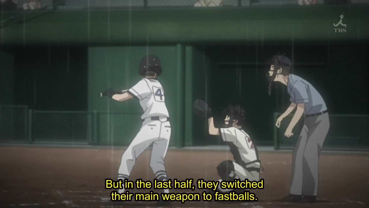 Let’s examine another moment. A semi-flashback scene occurs halfway into the first episode of Ookiku Furikabutte. Two guys are trying to determine why batters are so flummoxed by Mihashi’s pitching. At first, they were swinging and missing at curveballs: