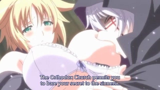 Wow. That last screen is easily one of the more awkward animation stills I’ve ever seen. Doucheface (I really don’t know his name) looks like he’s nomming her boob, and the overall affect is just… weird. I don’t understand at all how this could be titillating. If anything, his facial expression and the way his head and face are drawn make me think of a frog.