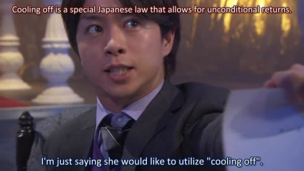 Of course, the landlady’s husband pops a vein after finding out about her 500000 yen vase. Enter Tamura and his public notary powers. No, seriously, he has powers. He throws out law terms like they’re video game moves.