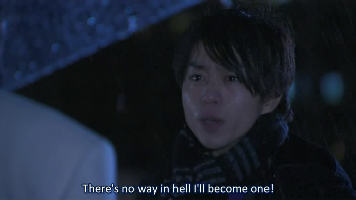 So here comes the meat of the show. The annoying kid’s father can’t pay the tuition because he loaned 4 million yen to a close friend. That close friend can’t afford to pay back the loan because he’s barely scraping by as it is with a fruit and vegetable shop. Misuzu represents the father and Tamura represents the shopkeeper so this is where they butt heads. While Misuzu is busy playing the one-dimensional, man-hating uber-bitch role she’s been cast in, Tamura pines, “I was wondering if there was some solution that would make both parties happy?” His boss literally socks him for even suggesting such a humanist idea. C’mon, we’re lawyers! All lawyers are heartless! TV taught me this. Continuing on, the punch only sets up the incredibly corny ending to the first episode. Tamura rises tearfully from the ground, in the middle of a rainstorm, and boldly proclaims to the world that he’ll never become a jaded attorney. Never!