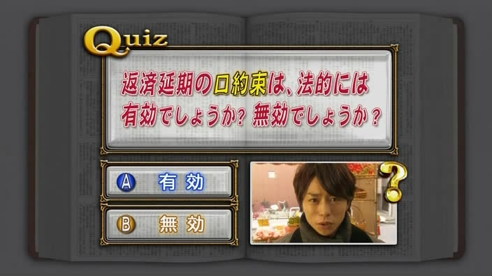 The show then literally pauses for the audience to sit there and go “Hmm, is the verbal delay of payment lawfully permitted or not?!” After the show expects you to answer the TV like a 5 year old, Tamura excitedly exclaims, “The answer is ‘A: Permitted!'” A little glitter effect highlights the right answer on the screen accompanied by a some stock fanfare.wav.