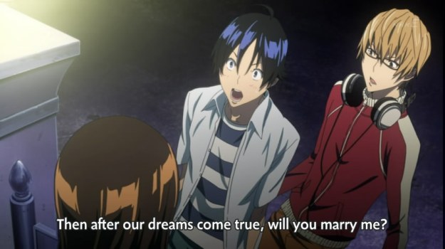 The anime’s earnest about its protagonists’ hopes and desires. I just wish the anime put the same thought into, well, everything else. I’m sure most high school bound girls don’t just jump at any chance to get married to a boy they hardly know, but I’m glad Bakuman‘s about the 1% that do! Kids are stupid, but c’mon. Maybe there’s more to Azuki, but despite her strong determination to be a seiyu — a determination probably as strong as the boys’ conviction to become successful mangakas — we don’t get to see any of it. It’s just not encouraging that aside from a couple minutes at the end of the first episode, she has since been relegated to an object in the background, Mashiro’s princess in the castle. We don’t know anything about her besides the fact that she blushes a lot and:
