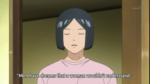 Early on, there’s a subplot involving Mashiro gaining his family’s acceptance. With the uncle’s death still lingering in everyone’s minds, obviously the decision to be a mangaka is going to be a little dicey. I’m not sure Bakuman pulled it off convincingly though. Both Mashiro’s father and grandfather are too readily accepting. When Mashiro first tells his grandfather, the grandfather immediately stood up, walked to some cabinet, and pulled out the key to his dead son’s studio as if he had known all along that Mashiro’s day would come. On the other hand, the mom comes off as a one-dimensional strict woman who just wants Mashiro to focus on schoolwork. She only relents because, well, the anime basically says she doesn’t know any better. No, really: