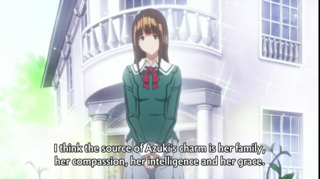 Well, gee, a good family? When you put it that way! She’s literally shining. Like a prize. Before a big house. A mansion. A castle… okay, okay, I’ll let it go, but it’s not like the anime is even subtle about it or anything: