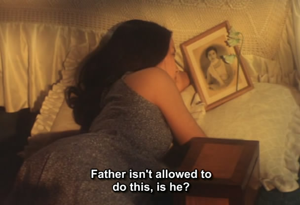 • The burning mirror scene seems to be the turning point for Oshare’s character. What does it mean? In the mirror, she sees the images of herself and her aunt continually alternating before both Oshare and the mirror crack and burn (with cheap fx). Does she become one with the mirror? With the house?