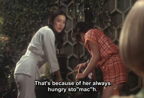 When I was watching the film the effects reminded me of the first time I discovered power point. I was supposed to be doing a interactive presentation for parts of the brain for my psychology class and I went completely overboard with screen wipes and the effects. Every word and picture swirled or faded in or had dancing rainbow ants surrounding it; with zero rhyme or reason. I read somewhere (and I can’t confirm) that Hausu was one of the first films to be heavily effects laden. To me the director seemed to be trying to include as many effects (and as many types of camera angles/music) as he possibly could.