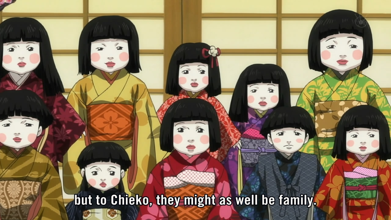 A lot of our other different experiences of Kuragehime seem to come down to what constitutes a mental disease and how to respond to it, which unfortunately involves just as much, if not more, gray area. If you think Tsukimi and Chieko have anxiety disorders or depression or obsessive complusions, best treated with therapy and psychopharmocology, then yeah Koibuchi undeniably crossed the line, as did I by calling Tsukimi spineless. And a lot of their actions are symptomatic of those kinds of diseases. But I would argue that anime just doesn’t often dwell on fine distinctions between personality quirks and dysfunction, and it almost never waits weeks for dosages to build up or group meetings to have an effect. Generally these things get resolves with tearful shouting matches and then confessions or flashbacks or whatever other silly anime devices. The tearful shouting match not resulting in the desired outcome, as in Koibuchi v. Chieko, seems to me to suggest that Chieko is not really dysfunctional, and just loves her dolls more than she loves her friends. In real life that diagnosis doesn’t make sense, but this is anime, so I analyze with the tropes available to me.