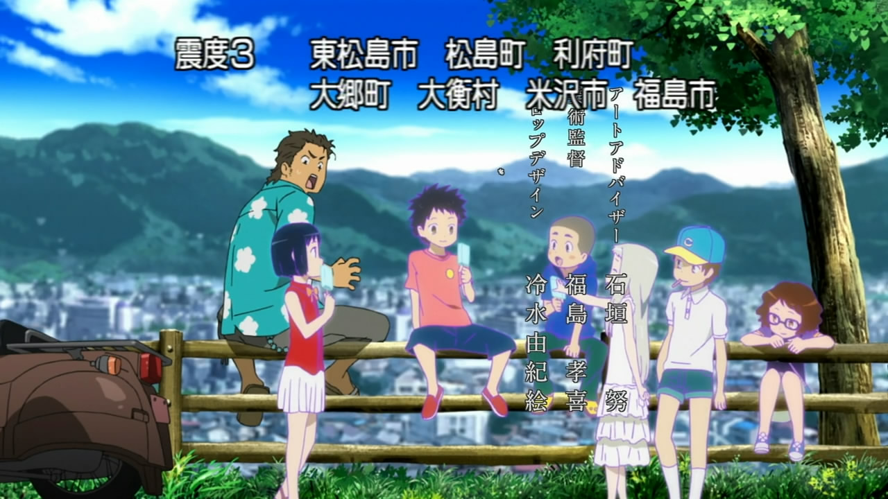 The theme of trauma. I think I’ve written about this before so just a quick recap of some general ideas. PTSD is like being trapped in time; sufferers of PTSD are unable to move beyond their moment of trauma and this usually manifests in a variety of ways. For war veterans, sudden noises can give them flashbacks. For Jinta, it literally plays out in two ways:  1) he sees the ghost of his childhood friend (in addition, she hasn’t effectively* matured in appearance or behaviorism whatsoever) and 2) he’s a hikikomori.