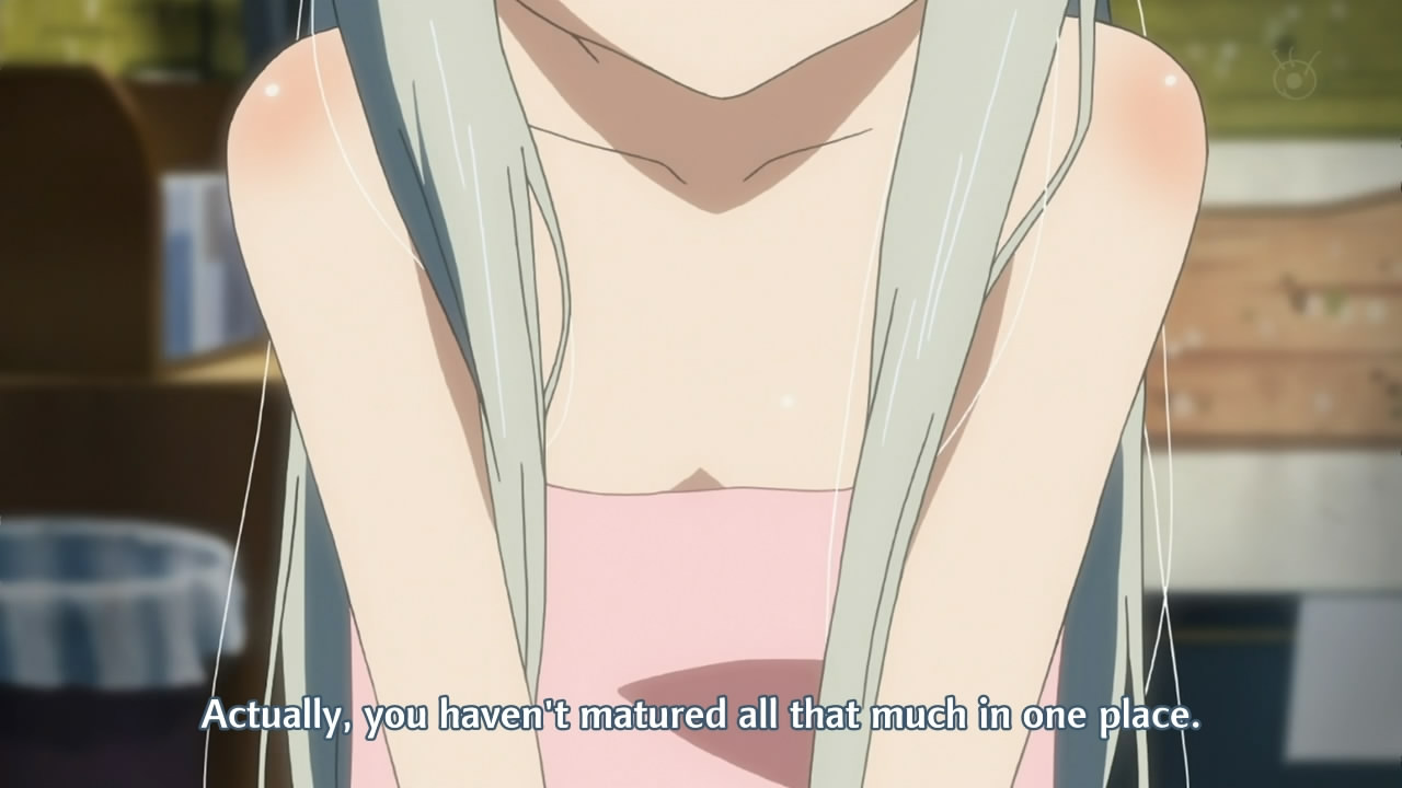 If you pay attention sex comes up all the time in this show (sometimes disguised, cf Yukiatsu’s “hobby”), to the point that it can’t be an accident. There’s a nonzero chance that this show is going to wind up being about these characters maturing into being capable of healthy romantic / sexual relationships (once they get over their guilt about Menma, yadda yadda), and in that case the fan service — while still annoying — would turn out to be thematically relevant.