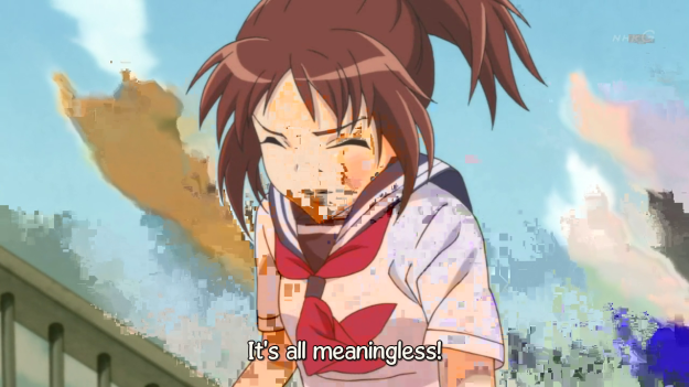 I don’t care what the supposed primary focus of the show was. It had all of the elements and conventions of a narrative. Mythbusters doesn’t have a narrative. The guys don’t debunk myths within a grand scheme of a story. They just do it and they do it in an interesting way. Moshidora bothered to include a plot and as such, it will be judged in comparison to anything else that has a plot. Just because the show also wanted to educate doesn’t mean it gets a pass on phoning in a boring ass story.