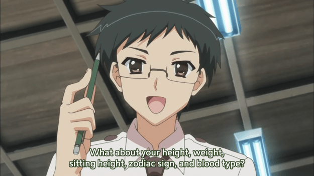 During a designated break period in class, the masses huddle around the new transfer student. Bombarded by prying inquiries, Kazuma is lost and can only stammer out a few meek responses.