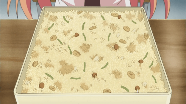 Lunch rolls around and Ui brazenly slams her meal upon the desks they had pushed together as a makeshift lunch table. Her lunch: a fuzzy carpet littered with fungus and mold. Kazuma quips if she’ll be munching on her carpet alone, to which she answers, “Of course not.” She proudly presents her muffins to him.