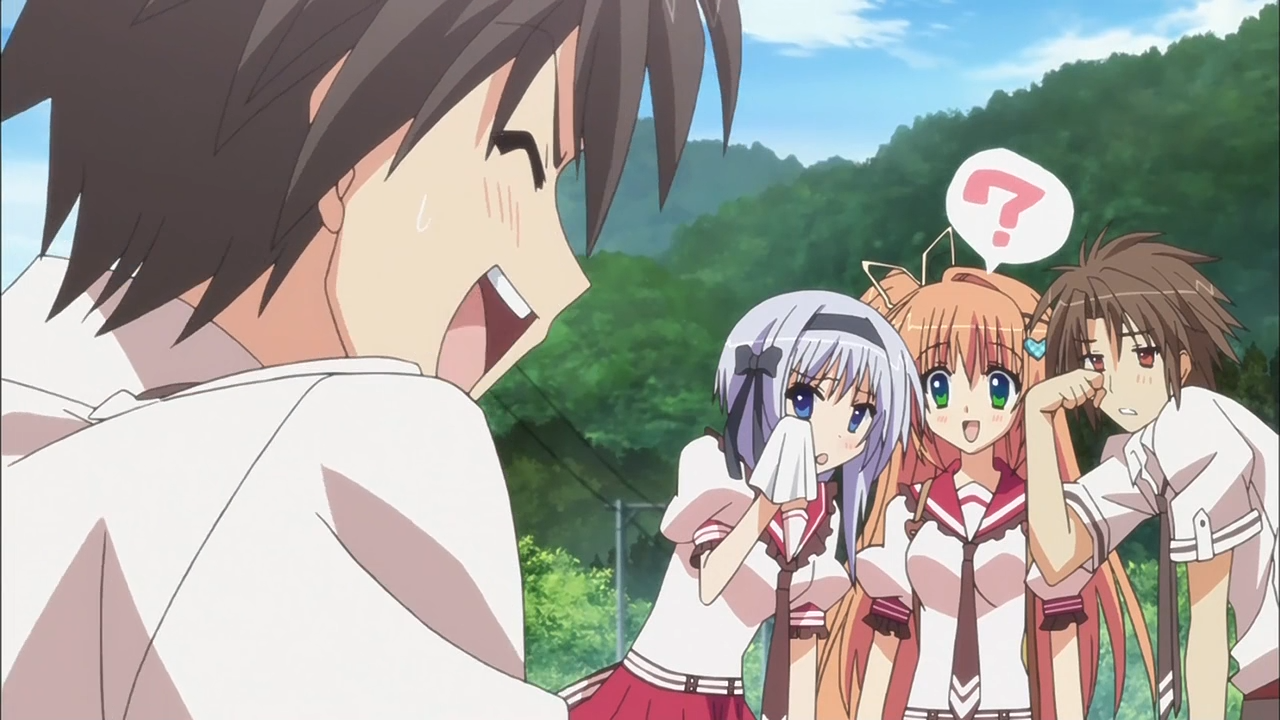 Kazuma scolds his meddling interlopers, hoping only to retire to his home in peace with Ayumu in tow. Finding no escape, however, he is forced to continue his banal stroll with his classmates through the countryside. After some awkward moments of silence, Tsumugi observes that Kazuma slows his walking pace to match his petite brother.