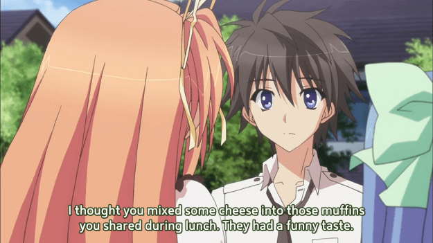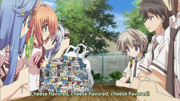 Undeterred, Ui hopes to seduce the unsuspecting Kazuma with her skillful nibbling of cheese-flavored rods. Kazuma, a man of vast experience, is — again — unimpressed. Speaking of cheese, he is reminded of Ui’s cheesy muffins. He then taunts Ui, professing that her cheese-flavored muffins were nothing compared to Ayumu’s Kappa Ebisen’s.