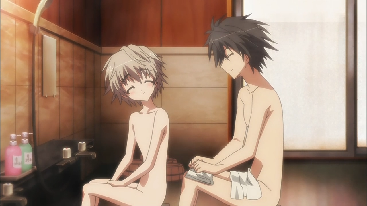 I don’t know how brave it is to show a flat chest with pink nipples (when they don’t normally draw anything for guys) just to say “Whoa whoa, don’t call us a perv — that’s a shota!” For all intents and purposes, Ayumu is treated like most harem lil sis.