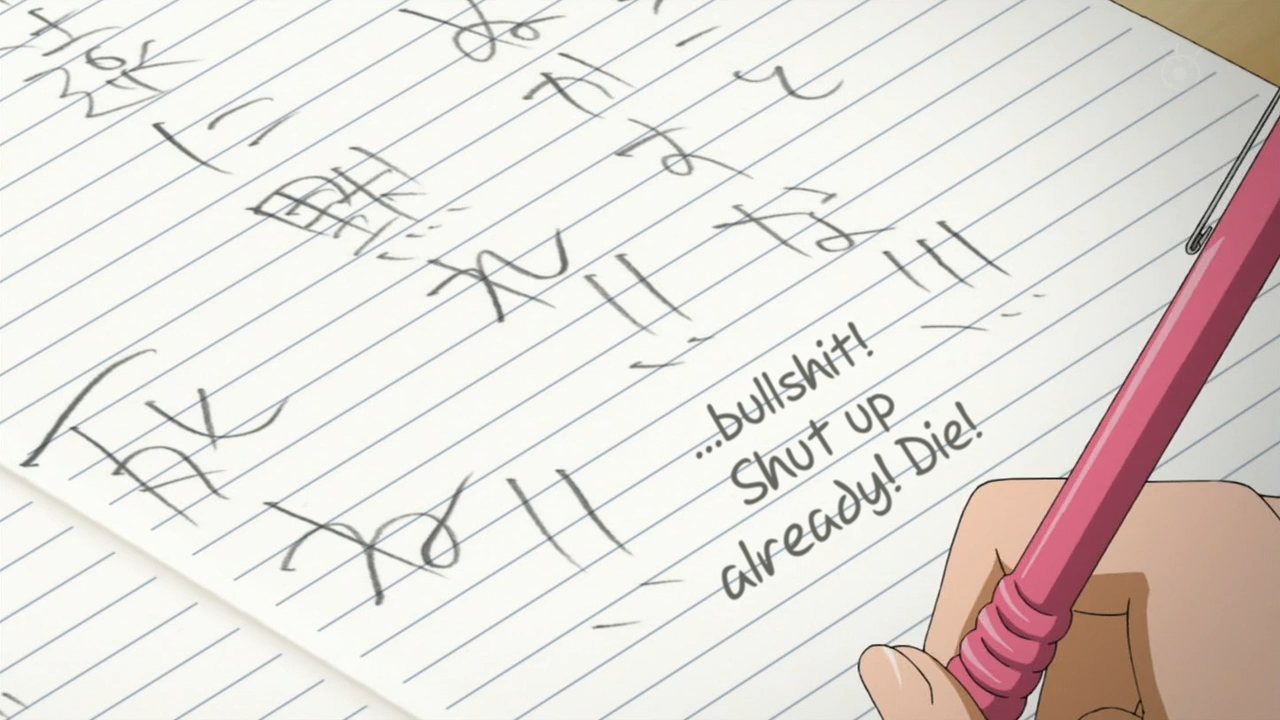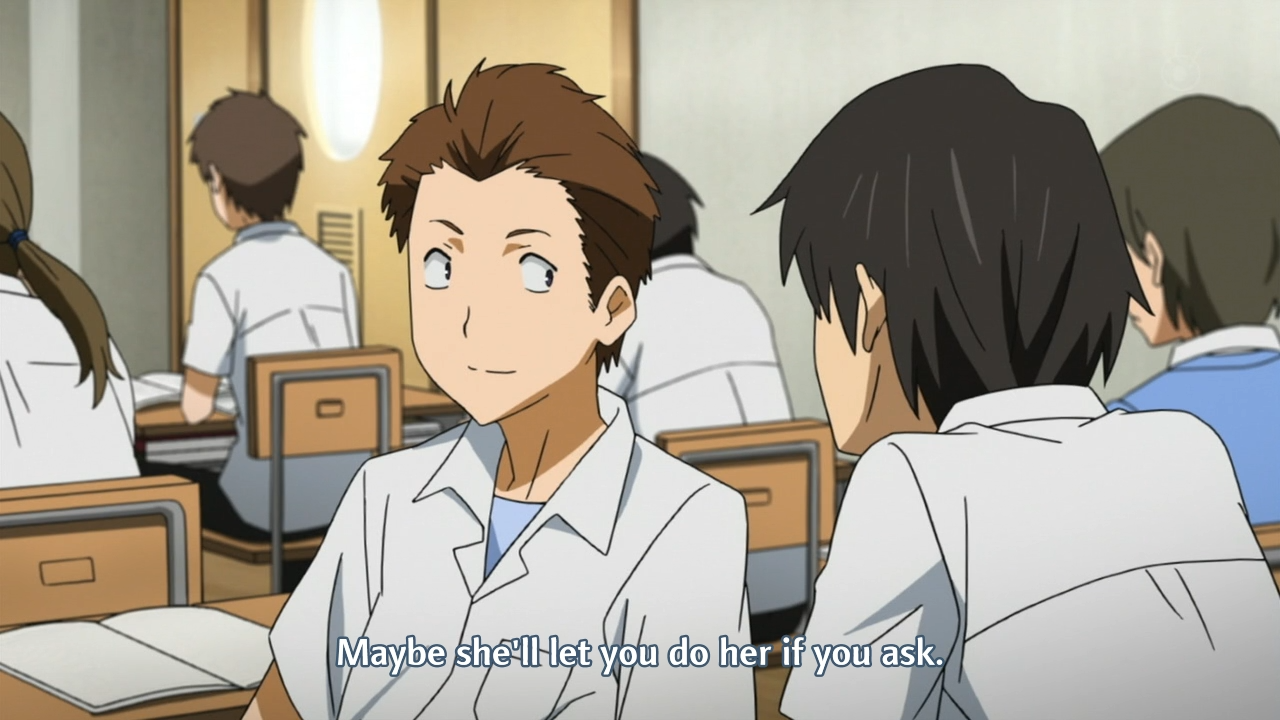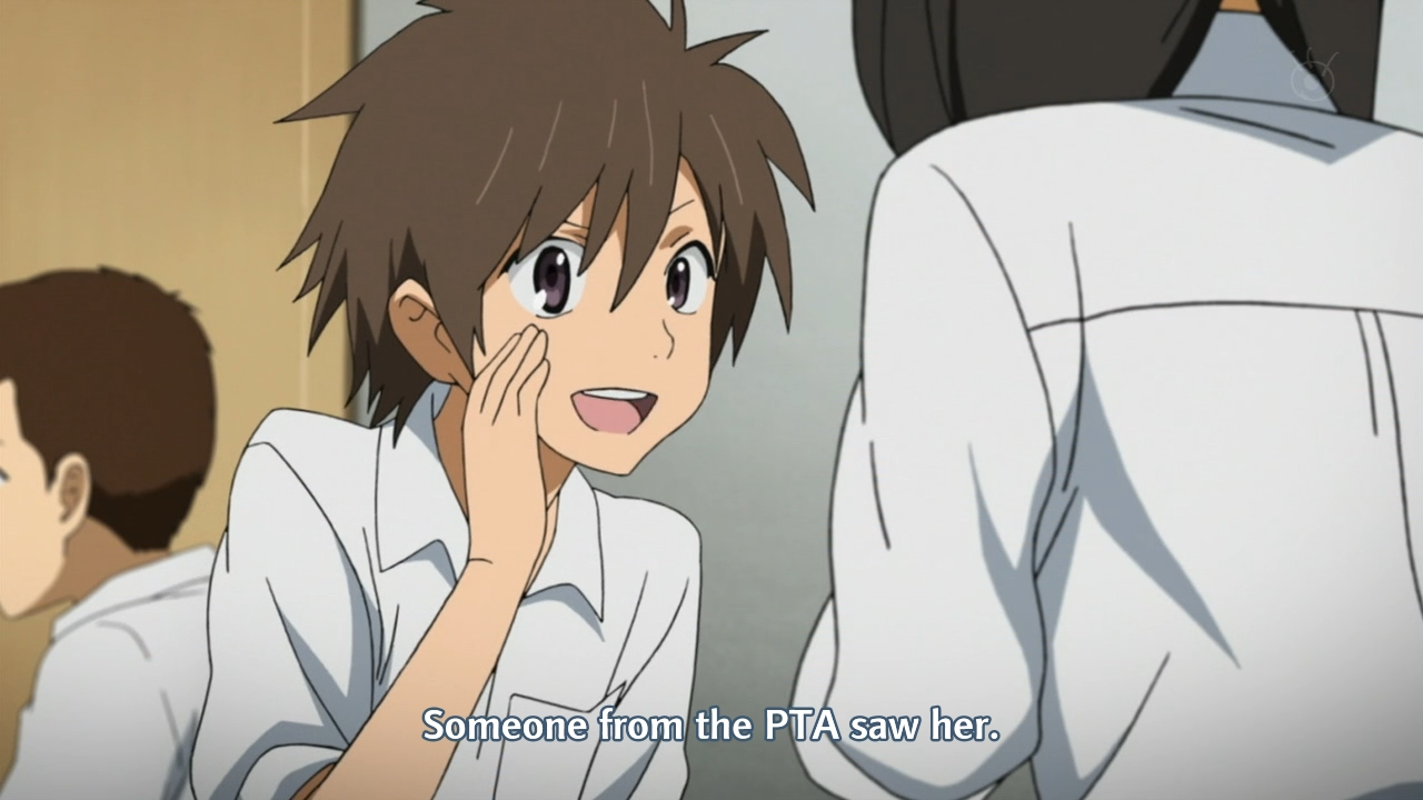 As always, when we think we have it bad, someone else has it worse; rumors are circulating the school, but it’s not about Jinta. Somehow, Anjou’s brief excursion to the mere entrance of a love hotel has reached school grounds and, well, kids can be so cruel.