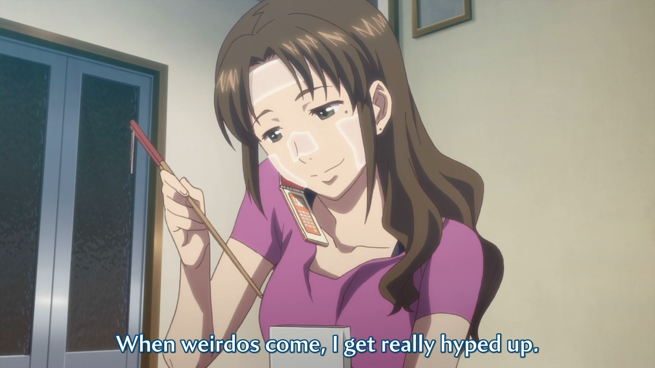 On a bit of a tangent, I like how the Wikipedia entry for this anime describes Takako as “erratic.” Anyway, Takako advises the staff to prioritize special clients, but Ohana objects, parroting the creed that all customers must be treated equally. Ohana then decides to go drag Tohru back to work despite it being his day off. I guess Kissuiso has never heard of seasonal temp workers.