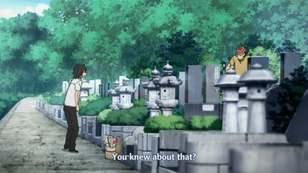Halfway into the episode, Jinta visits his mother’s grave with his father. Why do I begin this post here? Ironically, this scene is somehow a brief respite from the eye of an emotional hurricane that is leaving almost nothing in its wake since the start of the episode.