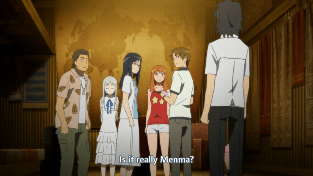 Ever since Jinta started to bring Menma up, it has mostly opened up old wounds. With Irene as the latest casualty, Yukiatsu pleads (in his own haughty sort of way) with Jinta to give the Menma talk a rest. Admittedly, he says, he’s the last person to judge, but he doesn’t want to see anyone else get hurt. Anjou, taking cues from previous episodes, observes that Yukiatsu is again mostly referring to himself.