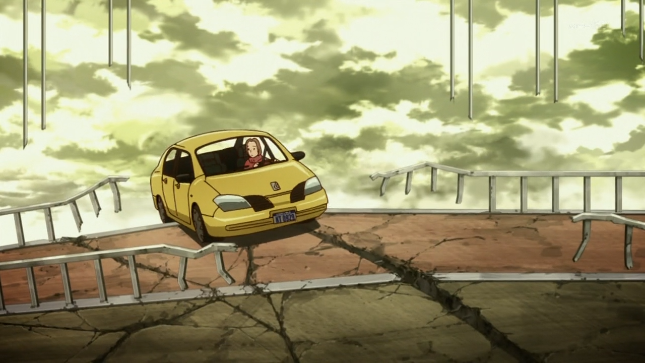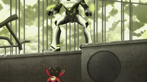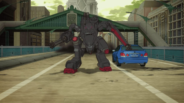 It stumbles backward and, well, what do you know — there’s a car just sitting there for the mecha to use as a weapon. Even better, there’s a helpless civilian in it.