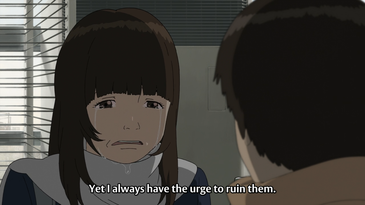 Hiroka then disappears for nearly an hour of the film’s length. She only returns near the end of the movie in a convenient attempt to wrap up loose ends. It is here that Hiroka suddenly drops a major character revelation about herself: she has the strange urge to ruin beautiful things. Obviously, she’s referring to herself and enjo kosai. What would drive a young middle schooler to such self-loathing? Instead of a deeper exploration of Hiroka and like-minded young women, we get a tepid speech from Makoto about how Hiroka is not all that different from other people and we are all made of different colors. Yes, really.