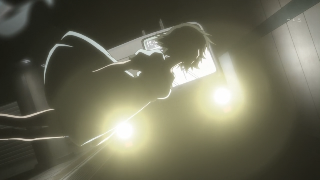 Oh. Somehow, Okabe manages to escape his capturers again… I dunno, magically. The anime just cuts to yet another time leap. This time, surely someone of Okabe’s intelligence will get it right. But again, he goes about his mission alone. While he does get to Mayuri sooner this time, what happens next is, frankly, kinda ridiculous. Okabe takes her to the subway where they await boarding the next train. This just means Nae has to show up outta nowhere to ruin things. Somehow, somehow, Nae manages to trip and fall into Mayuri with enough force to launch her into the air (horizontally, I must add) and right into the path of a train.