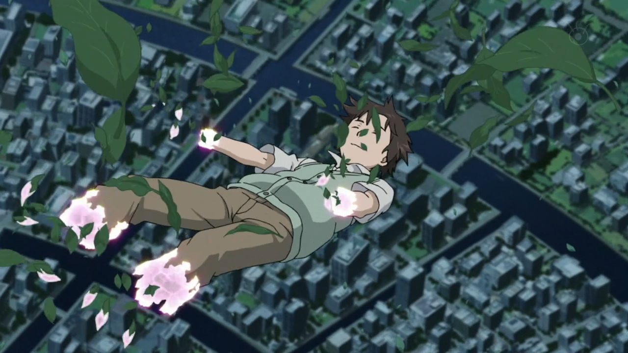The anime opens with a bunch of faceless goons chasing and shooting at a disheveled looking boy through what appears to be an extensive sewage system, a scenario reminiscent of The Fugitive. We then cut to a classroom in session where we meet Shion as he looks out the window and daydreams. In his imagination, he is high in the sky when he suddenly dissolves into leaves; the strong wind carries the leaves away.