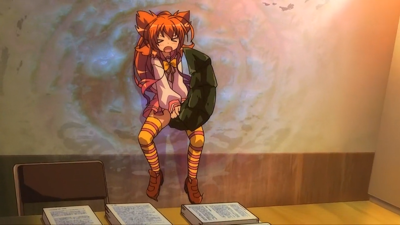 We first have a dude with crazy hair making boring small talk with a friend at school. All of a sudden, he gets run over by a truck. We then get two members of the student council sitting in an enclosed space that requires magic of some sort to enter and leave. No explanation whatsoever as to why this is necessary. The girl keeps begging for the guy to kiss her (why?) when something suddenly pops out from between her legs and forces the guy to do something about it (again, why?). Finally, there’s a naked loli frozen in rainbow carbonite, whining about her lover only to be shocked every now and then by cheap lightning effects.