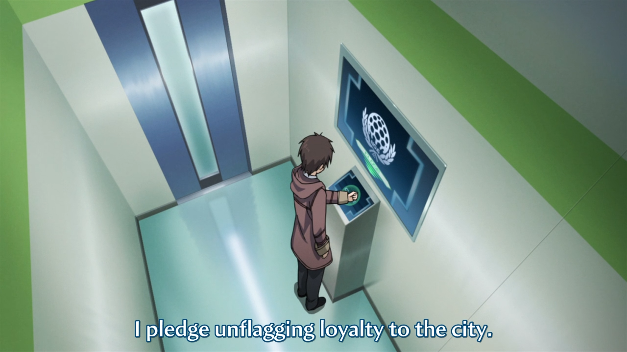 • We don’t merely see scanners quietly keep tabs on the citizens. As Shion comes and goes from his place of employment, a computer interface literally exhorts him to pledge his loyalty to the city. Likewise, Shion’s co-worker voices extreme opposition to any idea of defying the city’s authority.