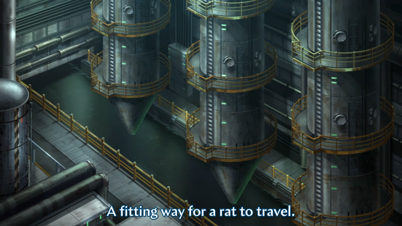 • Nezumi and Shion follow a rat and descends through a waste disposal facility to emerge into the real world.