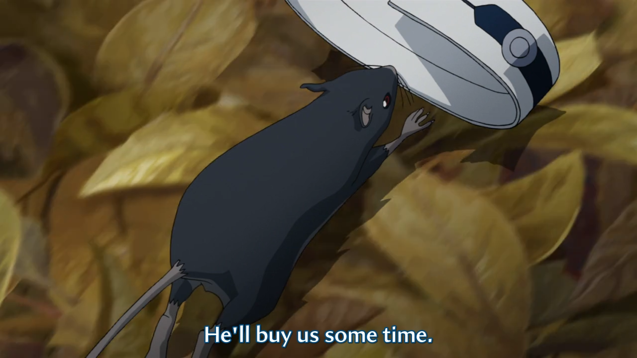 • Nezumi’s rat is unusually fast and smart for such a small rodent. It first helps the two young men by running in the opposite direction with Shion’s bracelet in its mouth (to distract the authorities attempting to track Shion’s whereabouts). Then it magically reappears in the waste disposal facility when Nezumi whistles for it.