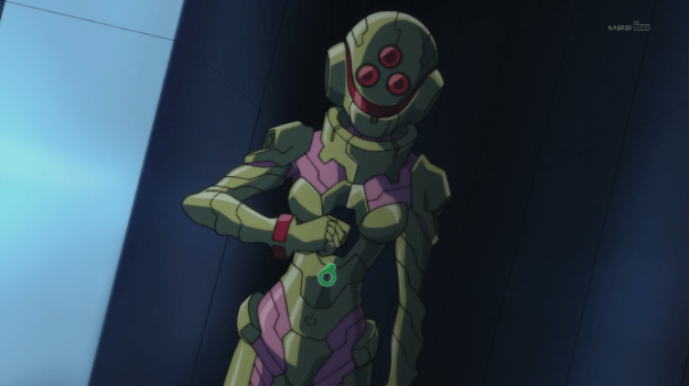She’s covered from head to toe in armor when other anime series would have had her in some bikini outfit instead. On the other hand, puke green and pink?