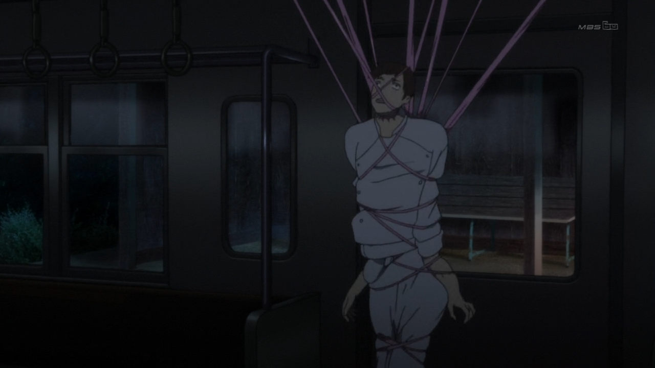 Oddly enough, Saya follows and watches some catatonic dude enter said “train” and get gruesomely murdered.
