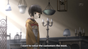 A prospective customer reacts poorly to Yune’s sales pitch and Claude blames her for smiling too much. Why do I feel so mis-characterized here? Gosh, the last time I worked retail, I had to be super cheerful and wear a shit-eating grin at all times. But according to Claude, people in the West wouldn’t trust a smiling loli as far as they could throw her:
