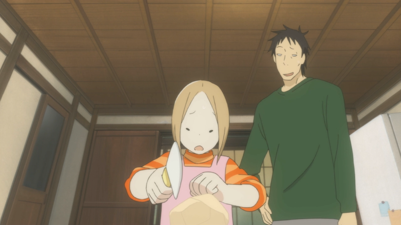 1. You mentioned in an earlier post how Daikichi’s father doesn’t seem to have a role in this anime but I wondered if he was not actually there to show what kind of home life Daikichi might have grown up with. I just laughed at how impotent he seemed when he tried to calm his wife with an orange and she just stared at it for a moment and then continued on. Perhaps it’s supposed to show that Daikichi was raised in a more strongly matriarchal household. Which perhaps impacts how he views raising Rin.