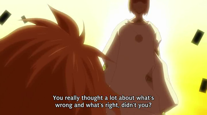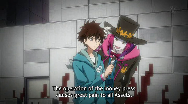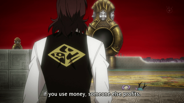 What exactly are the assets, anyway? Yoga’s relationship with his is really creepy to me. In real life a financial asset is usually a chunk of a currency or good that you expect to go up in price, or part of a company or government. They do not typically ask you to kiss them, or float around inside of your pokeball/special financial district card, curled in the fetal position. Meanwhile, Mikuni’s asset, Q, turns out to be his dead sister. It would be even less OK to kiss her like Yoga does Mysu. And the whole asset fighting system was weird. It makes finance seem like a zero-sum game, which it isn’t supposed to be. Exchanges should happen because both sides want what the other has, so they’re both better off afterwards. The giant coin in the financial district appears to be broadcasting a passage from Adam Smith the first few times we see it. The full quote is long and boring, but it relates to how personal self-interest in exchange leads to both parties being better off, even though neither was intentionally acting on behalf of the other. But someone’s always worse off after a “deal” in the financial district. In one case, both parties seem to suffer grave injury. It’s weird to find myself defending finance; my prescription for the current system involves firing squads, but I don’t think borrowing and loaning money is inherently a bad thing.