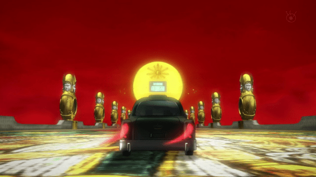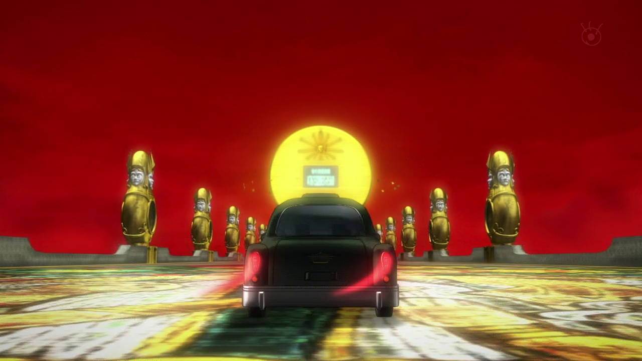Suddenly, Yoga is visited by a creepy banker in a Joker costume named Masakaki, who tries to convince him to take out a loan, with his future as collateral. Yoga is startled, but after thinking about it turns Masakaki down flat. He’s not interested in taking on risk when he sees a sure thing in front of him: if he works hard and studies a ton he can live a simple life, work for the government, and have a wife and a dog and two and a half kids. Unfortunately for him, he gets curious about what will happen if he withdraws from the mysterious down payment Masakaki leaves in his account. Apparently doing so implies that he agrees to the contract and he’s whisked off to the Financial District.