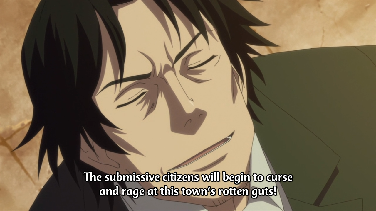 I suppose this bothers me because it isn’t so much the fact that the people are re-claiming their agency from a totalitarian government. Instead, we seem to have a few fated and ordained individuals doing everyone a favor like the messiahs — or happy prince, in Shion’s case — that they are.